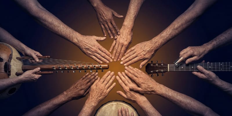 The scene spans centuries of musical evolution in a single continuous piece of music. It opens in acoustic Delta Blues and moves through traditional African percussion, blues guitar, psychedelic rock, electronic drum beats, and the laid-back groove of 1990s West Coast rap, not as a mashup or a medley, but as a single continuous piece of music that undergoes transformation while remaining recognizably itself.